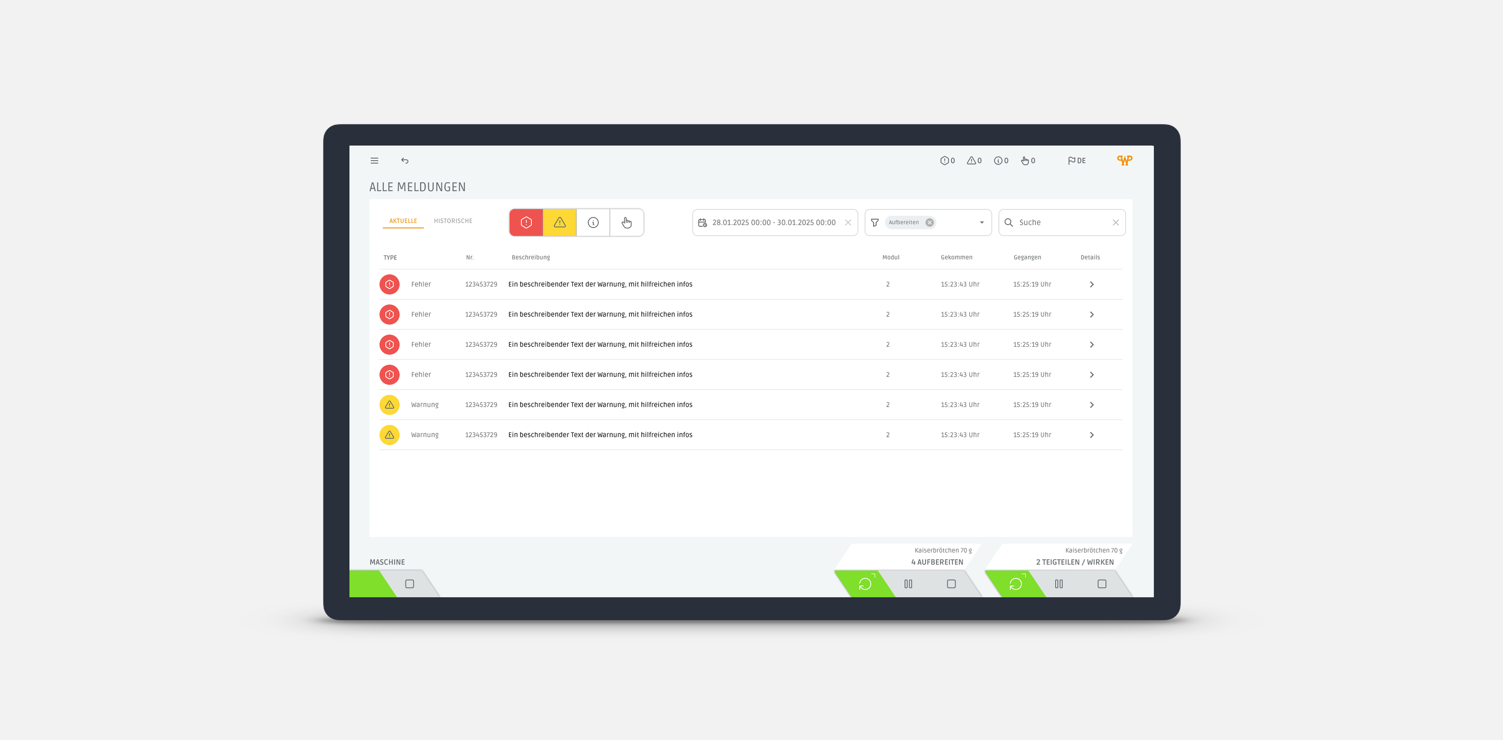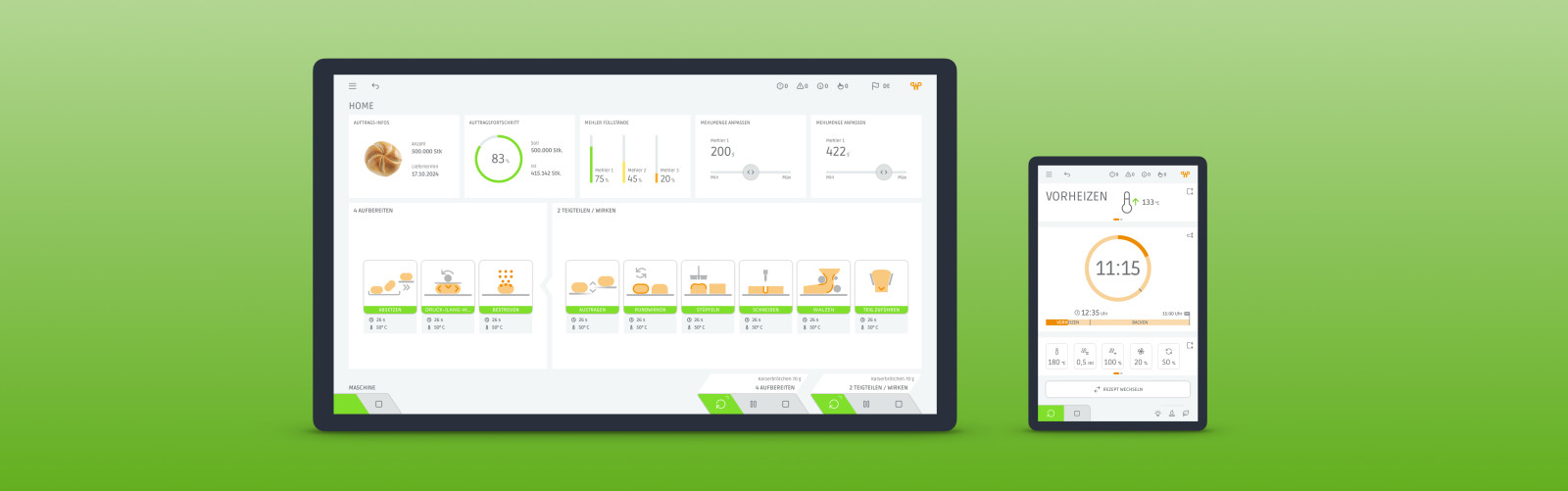 Das neue HMI basiert auf einem klar strukturierten, responsiven UX/UI-Konzept auf Web-Technologie-Basis. Es skaliert von Full-HD-Landscape-Displays großer Anlagen bis zu Portrait-Displays kleinerer Backöfen wie dem Rototherm – mit durchgängiger Bedienlogik über alle Maschinen hinweg.