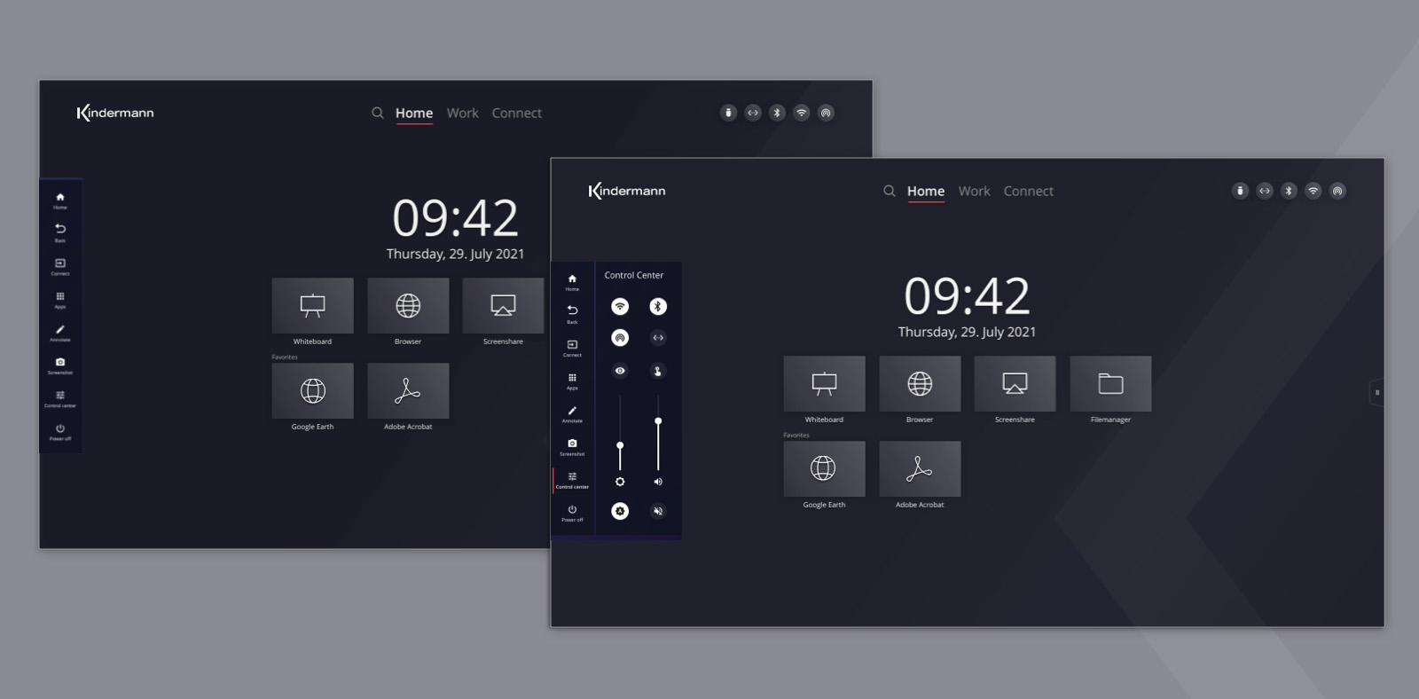 When we developed the user interface, we placed special emphasis on ergonomics. The Kindermann displays are up to 86 inches tall. When operators stand in front of the displays, they have a limited field of vision or a large area in front of them on which to interact. Therefore, it was important to us to arrange controls clearly and ergonomically, and we made sure that menus could be accessed from both sides.